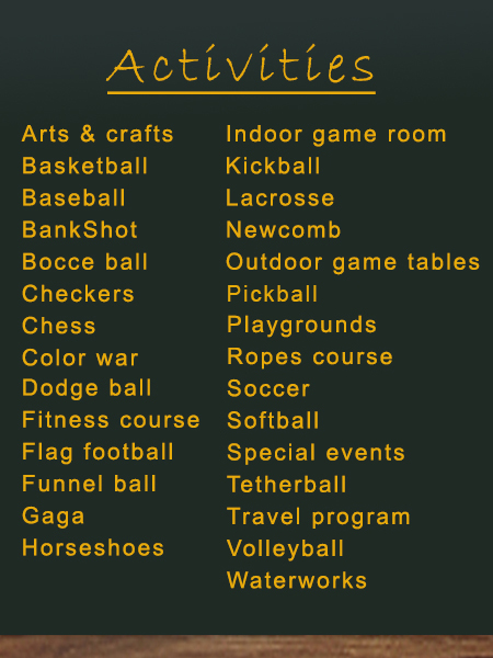 Our indoor and outdoor recreation areas give children plenty of space to be active. The outdoor park-like grounds consist of three playgrounds, four athletic fields, basketball court, beach volleyball court, fitness trail, deck hockey rink, three heated swimming pools, high and low adventure zip line challenge courses, gaga courts, bocce, horseshoes, tetherball as well as a miniature "Key West" play village and Discovery Ball Pit.